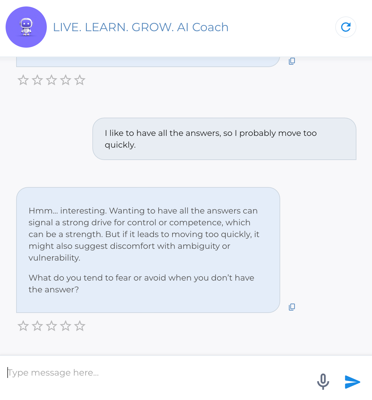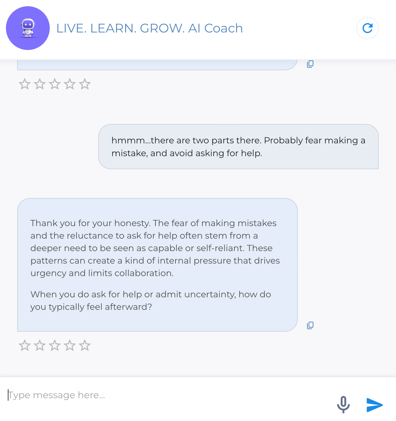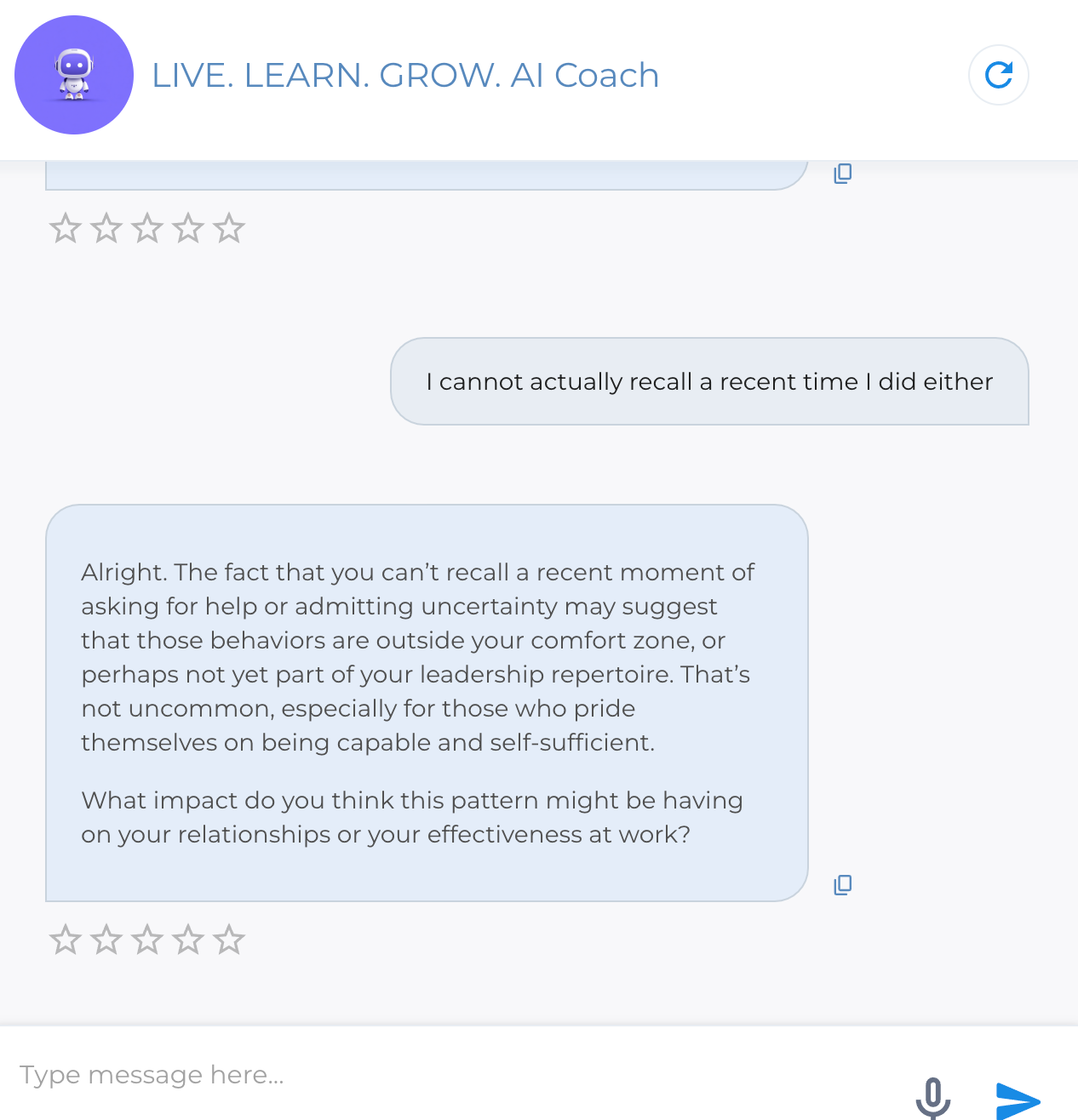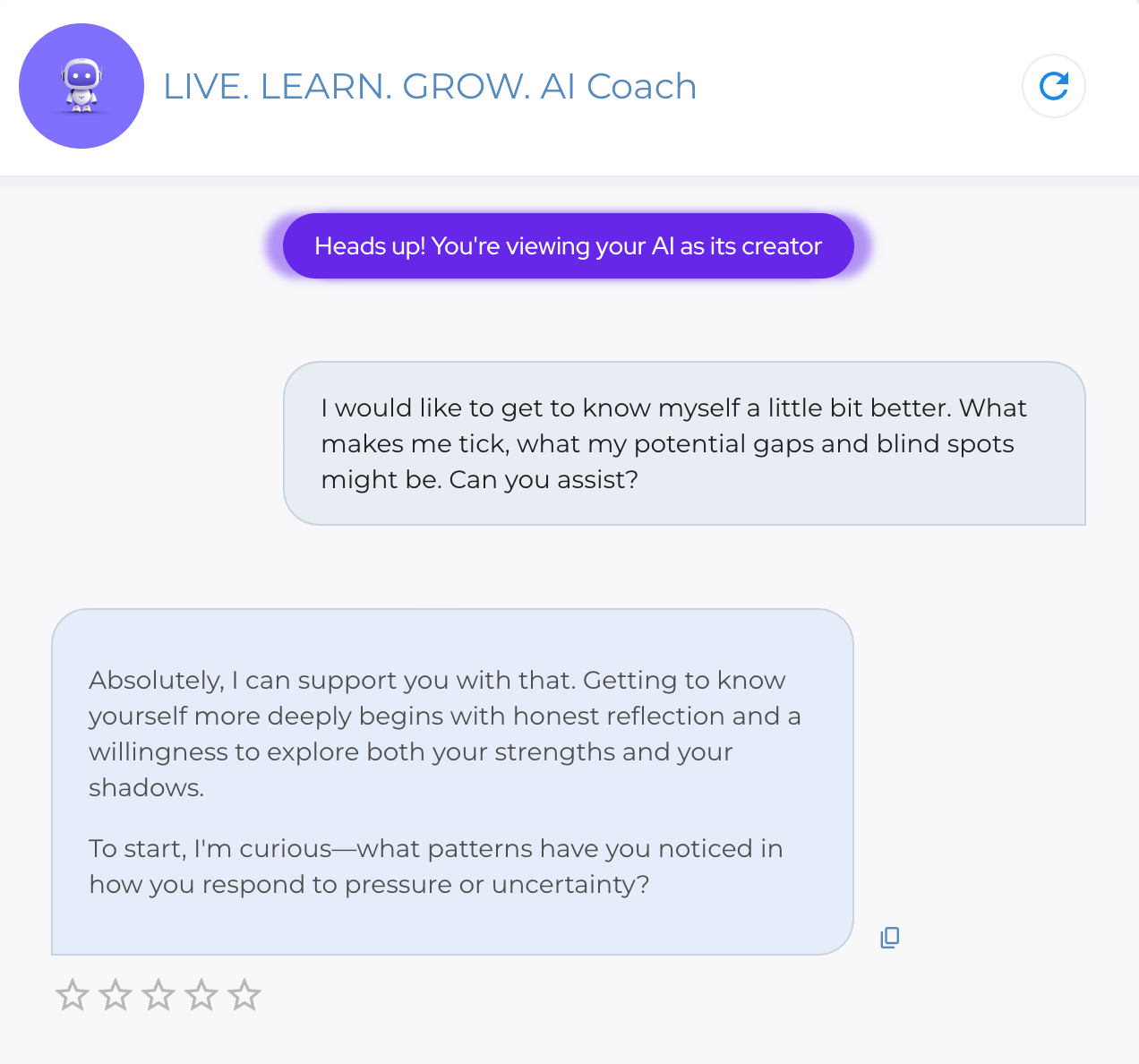 To demonstrate, I started a conversation with the LIVE. LEARN. GROW. AI Coach that I have build/designed based on my own coaching approach. Here are a few snippets of how the initial inquiry went: